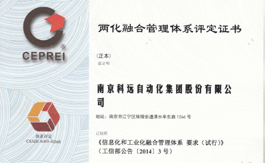 科远股份荣获两化融合管理体系评定证书